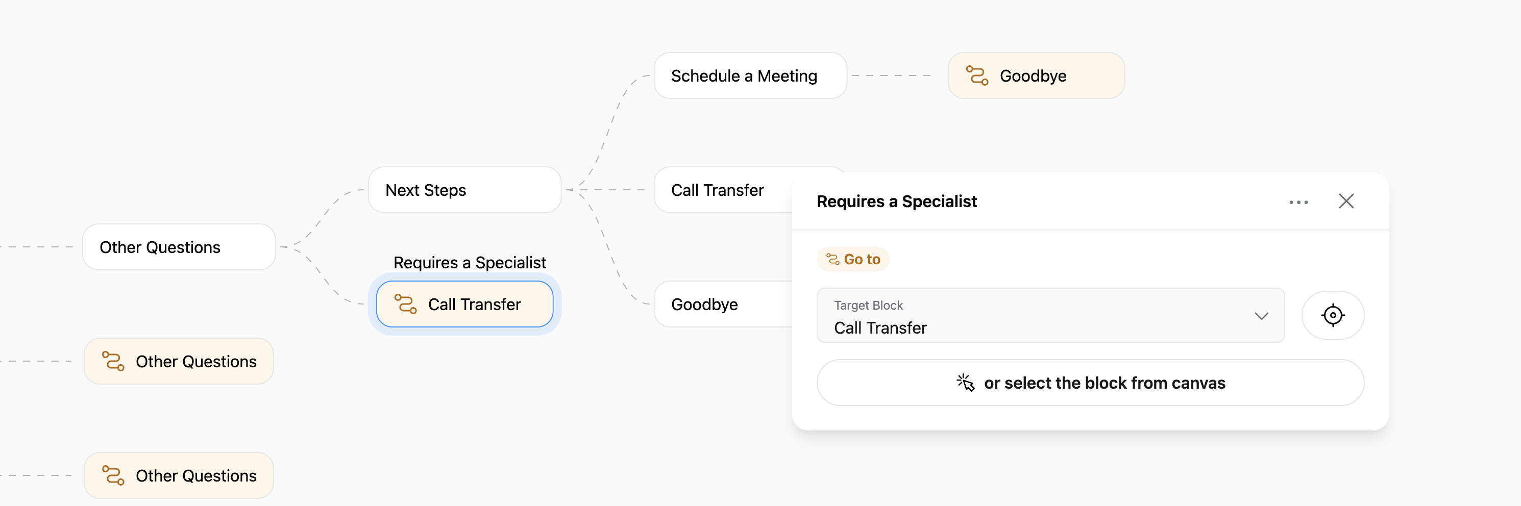 Go to Block. - Choose the destination node. Optionally, you can set a title to specify if the script should lead to this node based on client’s latest response.